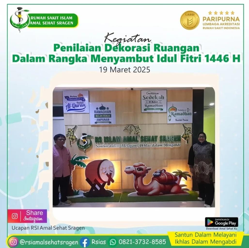 Dalam rangka menyambut Hari Raya Idul Fitri 1446 H, RSUI Amal Sehat Sragen mengadakan berbagai kegiatan yang tidak hanya mendekatkan hubungan antar karyawan tetapi juga memberikan kesempatan untuk mengekspresikan kreativitas. Salah satu kegiatan yang paling menarik adalah lomba dekorasi ruangan yang diikuti oleh seluruh bagian di rumah sakit ini. Selain lomba dekorasi, kegiatan lain yang juga turut meramaikan suasana Ramadhan di RSUI Amal Sehat Sragen meliputi bagi-bagi takjil, lomba performance Ramadhan antar bagian, dan buka bersama karyawan.