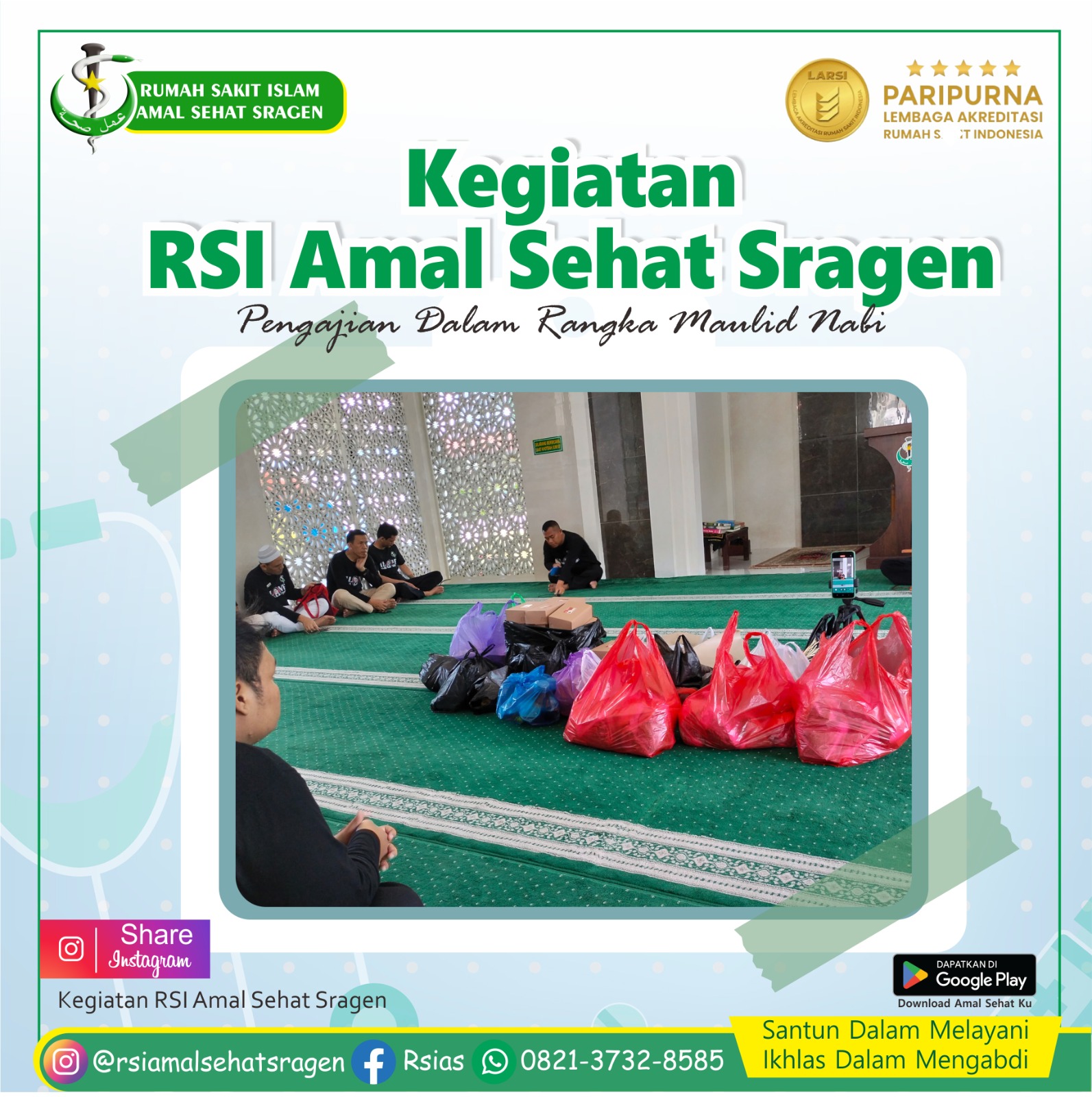 Pengajian diawali dengan pembacaan Maulid Nabi Muhammad SAW yang dipimpin oleh Bapak Ali Murtadho selaku kepala bagian kerohanian RSI Amal Sehat Sragen. Selain itu, acara ini juga diisi dengan tausyiah yang juga disampaikan oleh Bapak Ali.