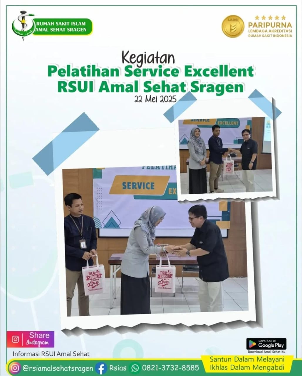Sragen, 22 Mei 2025 – Dalam upaya meningkatkan kualitas pelayanan kepada pasien dan masyarakat, RSUI Amal Sehat Sragen menyelenggarakan Pelatihan Service Excellent yang bertempat di Aula Abu Bakar RSI Amal Sehat Sragen pada hari Kamis, 22 Mei 2025. Kegiatan ini diikuti oleh seluruh jajaran karyawan dari berbagai unit kerja di lingkungan RSUI Amal Sehat Sragen.